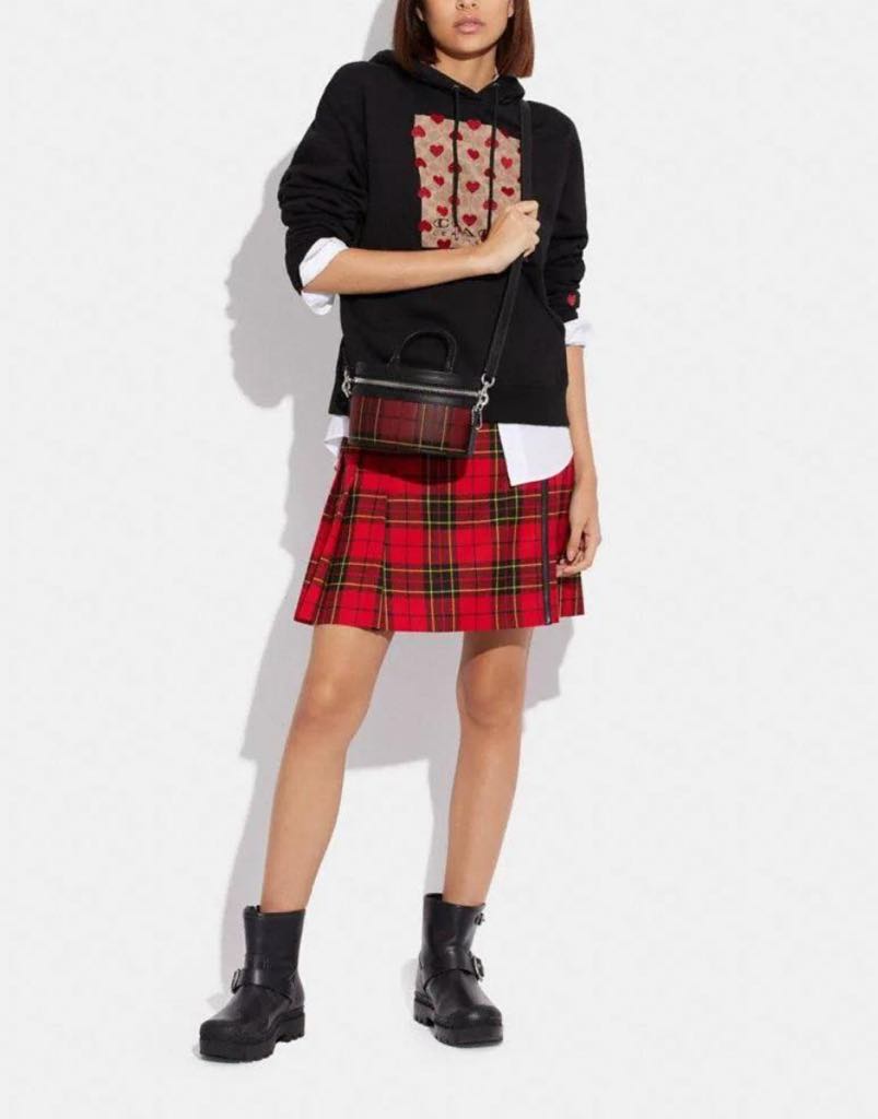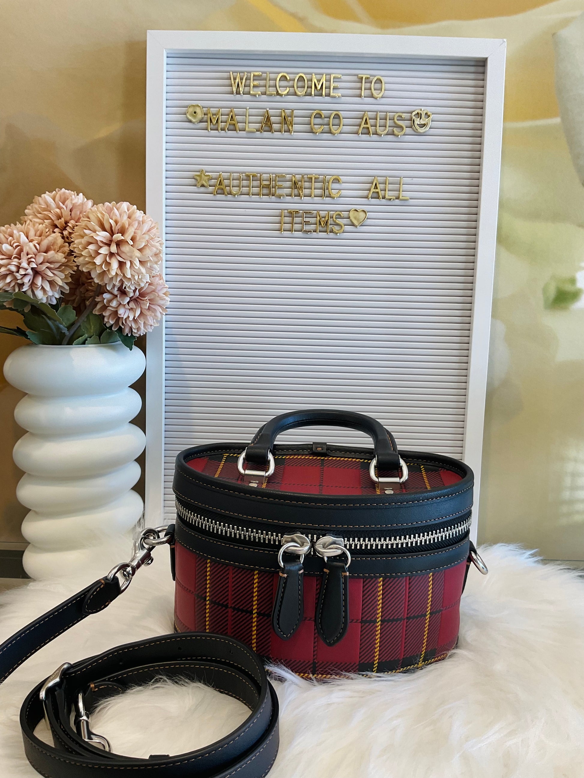 - Design: Features a red plaid print with black leather trim, a top handle, and a detachable chain shoulder strap.